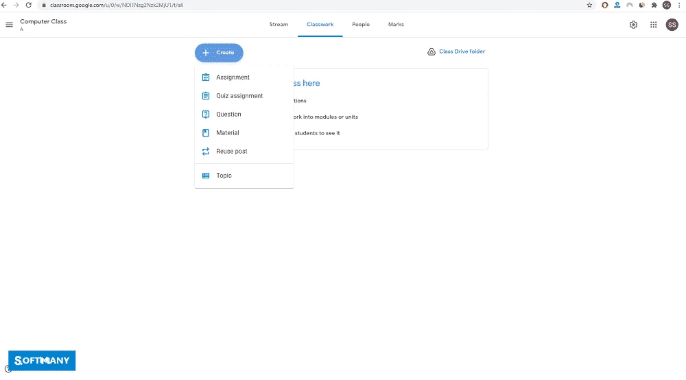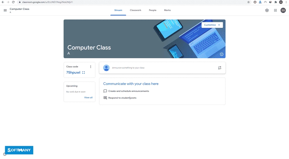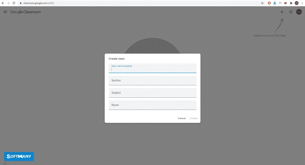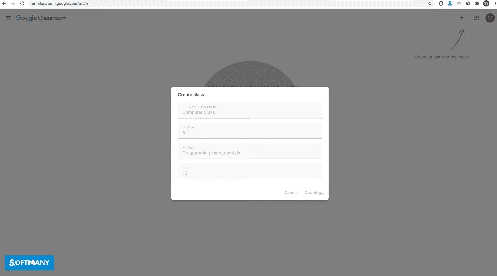 +ボタンをクリックしてクラスを作成し、同じ手順で次のクラスを作成できます。作成したクラスはホーム画面に表示されます。生徒を識別するために、名前、セクション、科目を追加する必要があります。